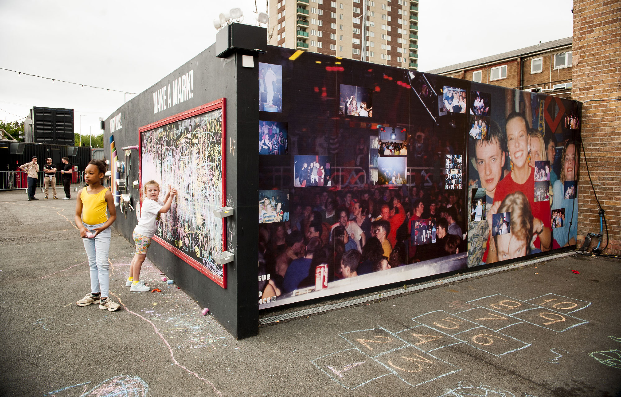 People came during the day to see the images and we also had a community screenprinting stand where people could screen print their own Quad t-shirts, then later in the afternoon the partygoers came to dance. Obviously the images stayed up, and it was great to see a different crowd looking at them, one guy even spotted his 20 year old self in a photo, which must’ve been quite a surprise. The party was amazing, over a thousand tickets were sold and there were hundreds of people dancing to Quad tunes, back in Bootle 35 years later, alongside these amazing, huge photographs. So, it was a great day and the photos remained for the summer and were seen by other crowds, like those at Sefton Pride or the Lionel Ritchie concert in August. The site is closed for redevelopment now, to reopen in 2027, but some of the images are still there and can be seen by passers by.