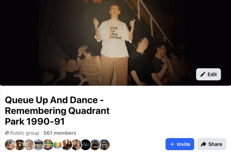 The archival side actually began before we received funding, as I felt that it was important to get to know the community as quickly as possible and introduce the project. The Quadrant Park Reunions Facebook group has been going for ages, and these people, along with the original DJ’s Andy Carroll and John Kelly, are really the people who have kept the spirit of the Quad alive for the last 35 years. It is their history. I actually never went, so was clearly an interloper into this community. I needed to make sure they knew who I was, what our intentions were, and what the project was all about, so I went ahead and set up a Queue Up And Dance Facebook group. Incidentally, the title ‘Queue Up And Dance’, comes from a t-shit that I saw in a photo on Quadrant Park Reunions. After a bit of investigation I discovered the t-shirt was made by a guy called David Bleasdale. I contacted him via Facebook and asked him if it was ok to use it as the project title and he was very supportive. The Queue Up And Dance Facebook group was important as we wanted to focus on the history of the club and archival material. The Quadrant Park Reunions page has loads of memes, tunes, and other bits and bobs, which are great but not really relevant to the project. The Q.U.A.D Facebook group attracted some attention and before long we had a few hundred people following the project.